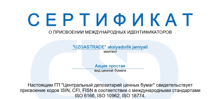 "Qimmatli qog'ozlar Markaziy depozitariysi" DK tomonidan 2023 yil 10 yanvarda "UzGasTrade" AJ aktsiyalariga ISO 6166, ISO 10962, ISO 18774 xalqaro standartlarga muvofiq ISIN, CFI va FISN sertifikatlari berilganligi ma'lum qilinadi